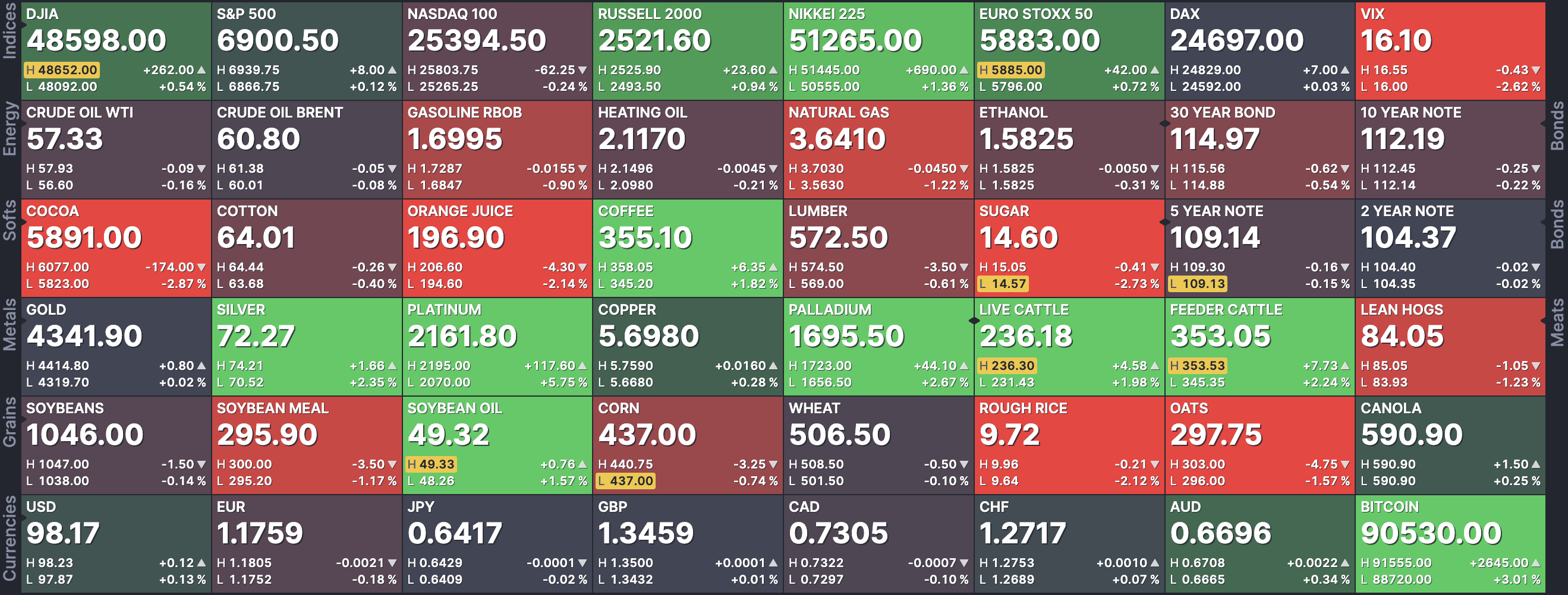 원자재와 가상자산 시장에서는 금값이 하락했고 은 가격은 소폭 상승했다. 달러화는 주요 통화 대비 보합세를 보였으며, 비트코인은 약 1%대 상승했다.